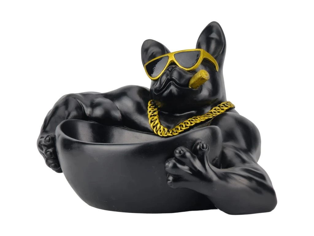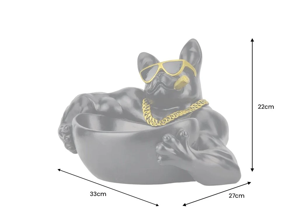 Dekorační miska Bulldog Boss je ručně vyrobená soška z polyresinu — odolného kompozitního materiálu na bázi pryskyřice, který umožňuje zachytit každý detail, drží tvar a je odolný vůči běžnému poškození. Povrch je ošetřen černým lakem s lesklými zlatými detaily domalovanými ručně.