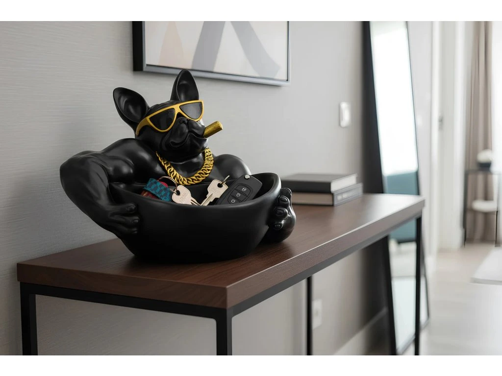 Kdo vládne předsíni, vládne celému bytu. Francouzský buldok v matné černé, zlatých brýlích a řetězu si v klidu drží tvoje klíče, peněženku nebo drobné — a přitom vypadá líp než většina dekorací v celém bytě.
